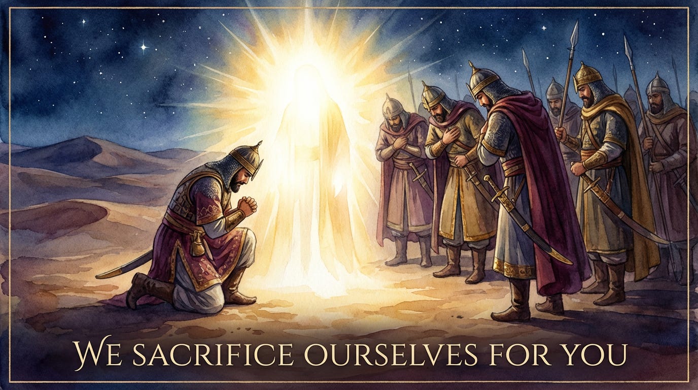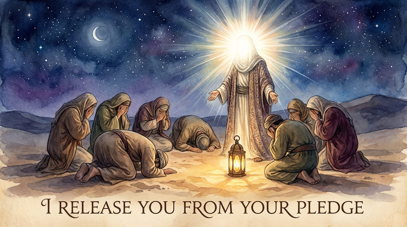 Imam Husayn gathered his companions, lifted the tent flap, and said, ‘Know that I will be killed tomorrow. I do not need your help. You have remained with me in this siege until now, ready to be killed. I accept this from you. Rise and leave. Whether you stay or leave, I will be killed. I will not be angry with you. I am pleased with you. I release you from your pledge.’