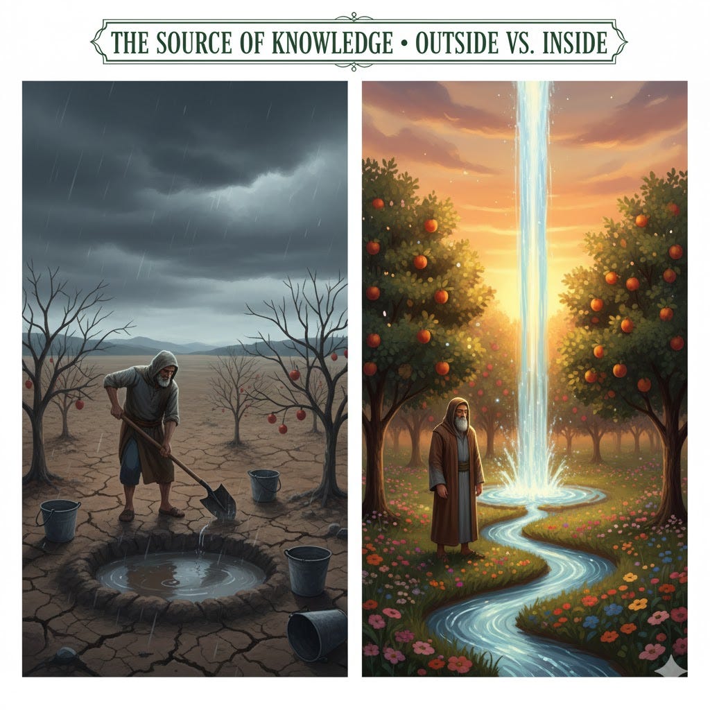 The Science of Study is like Farmer #1 - you collect knowledge from outside sources. The Science of Inheritance is like Farmer #2 - knowledge flows from inside you, like a spring. This is why scholars say: