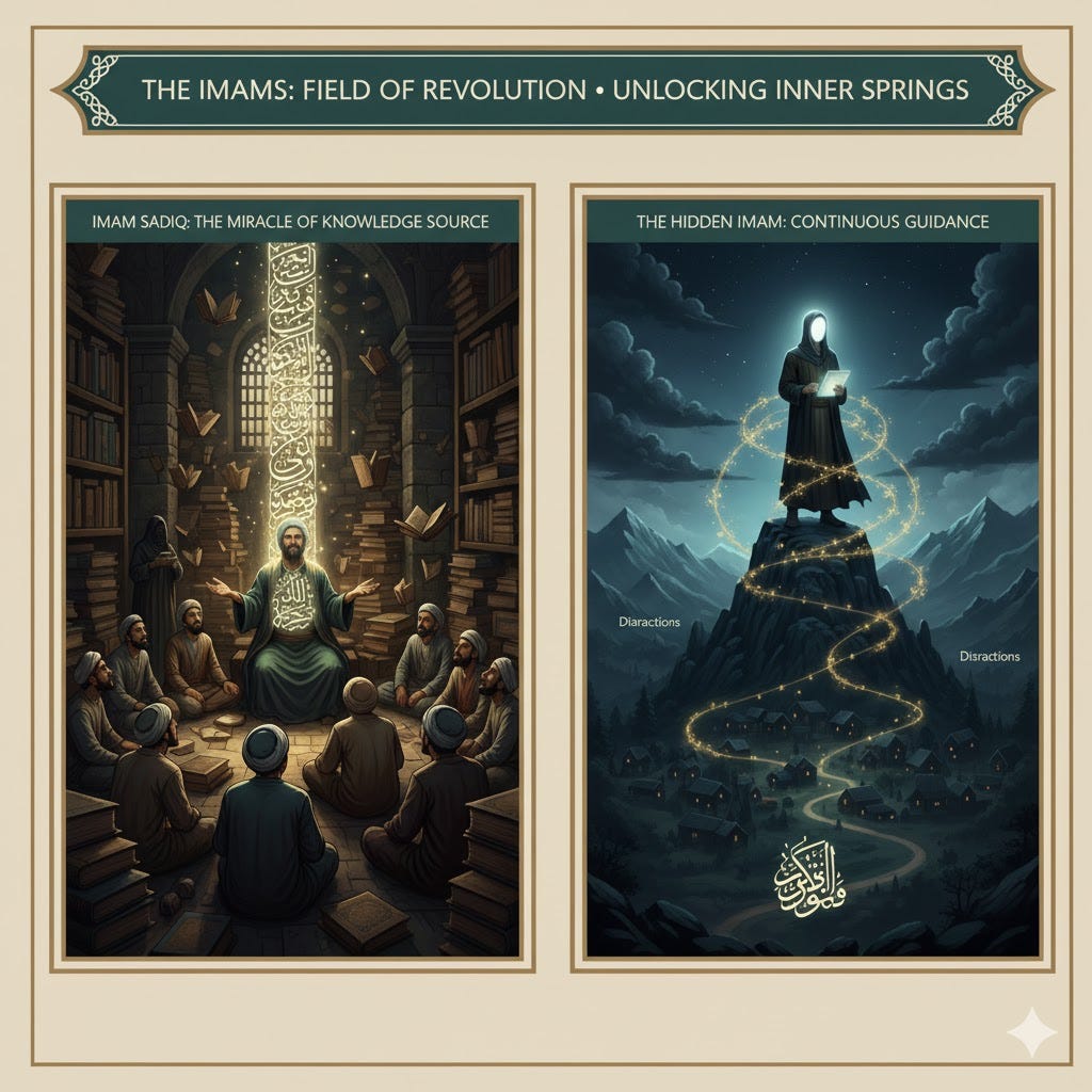 When you read these books, almost every page says: “Imam Sadiq said...” “Imam Sadiq said...” “Imam Sadiq said...” Think about it: If you tried to write just one book, it would take your whole life. How did Imam Sadiq produce so much knowledge while being watched and restricted by the government? This is the Science of Inheritance. Knowledge flowed from inside him like a spring. Imam Ali said: “We are the pioneers of knowledge. We are the field of revolution.” Connection with them has this same effect.